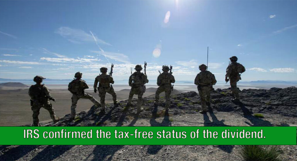 According to the IRS, U.S. tax law excludes from gross income a “qualified military benefit.” The Warrior Dividend is just such a benefit and is therefore not taxable. Service members will keep all of the dividends to use as they see fit.