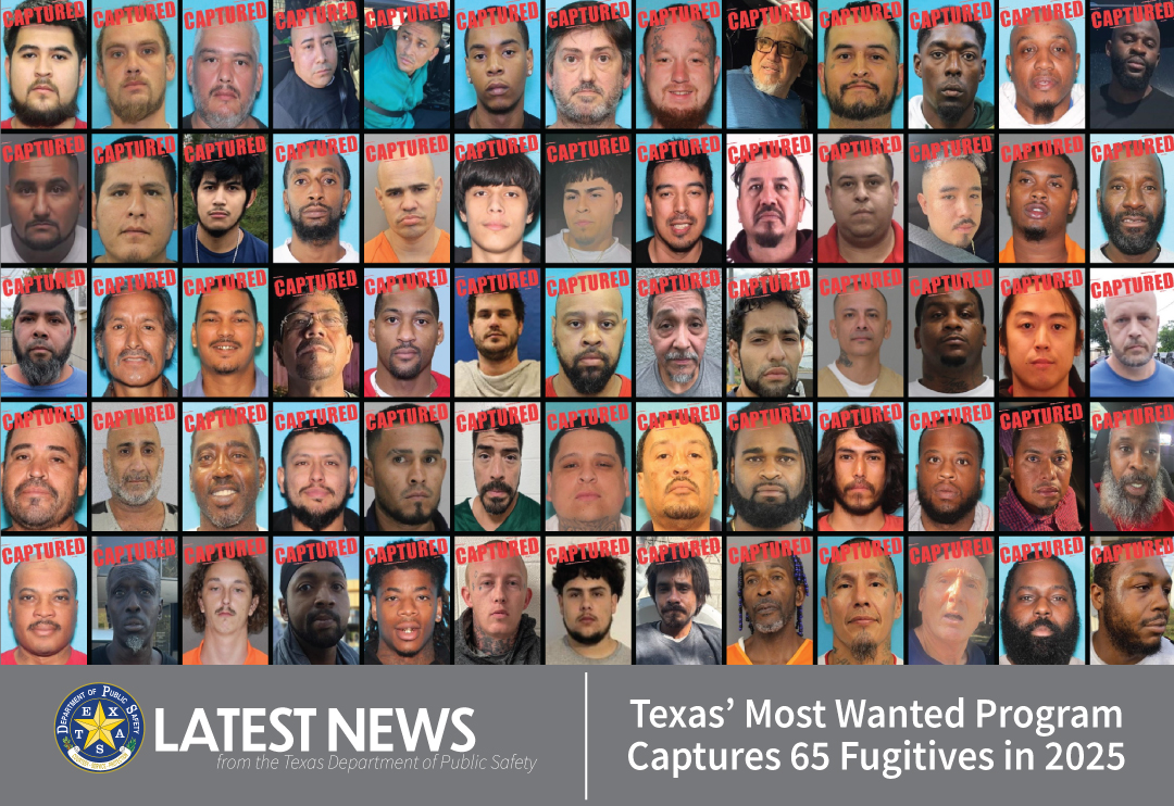 *The partner agencies involved in the 65 captures in 2025 included the DPS Criminal Investigations Division, Texas Highway Patrol, Texas Rangers, DPS Aircraft Operations Division, DPS Homeland Security Division, Austin Police Department, Bexar County District Attorney’s Office, Bexar County Sheriff’s Office, Brazos County Sheriff’s Office, Calcasieu Parish Sheriff’s Office (Louisiana), Cherokee County Sheriff’s Office, Cherokee Nation Marshal Service – Special Applications Branch (SAB), City of Dallas Fire Marshal’s Office, Corsicana Police Department, Dallas County Sheriff’s Office, Dallas County Marshal’s Office, Dallas Police Department, DeSoto Police Department, Department of Homeland Security (DHS)/Immigration and Customs Enforcement (ICE), Federal Bureau of Investigation (FBI) Dallas, Fort Worth Police Department, Garland Police Department, Grimes County Sheriff’s Office, Haltom City Police Department, Harris County Constable’s Office Pct 1, Harris County Constable’s Office Pct 4, Harris County Sheriff’s Office, Henderson County SWAT, Houston Police Department, Homeland Security Investigations (HSI), Hutchins Police Department, Irving Police Department, Jacksonville Police Department, Johnson County Sheriff’s Office, Kaufman County Sheriff’s Office, Kaufman County SWAT, Lancaster Police Department, Liberty County Sheriff’s Office, Lorenzo Police Department, Lubbock County Sheriff’s Office, Mansfield Police Department, Mesquite Police Department, Mexican Law Enforcement, Milam County Sheriff’s Office, Montgomery County Constable’s Office Pct. 3, Nacogdoches County Sheriff’s Office, Palmview Police Department, Pasadena Police Department, Rusk County Sheriff’s Office, San Angelo Police Department, San Antonio Police Department, Stilwell Police Department (Oklahoma), TDCJ-Office of Inspector General (OIG), Texas Attorney General’s Office, Tom Green County Sheriff’s Office, Texas Parks and Wildlife Department, U.S. Marshals Gulf Coast Violent Offenders Fugitive Task Force, U.S. Marshals Lone Star Fugitive Task Force, U.S. Marshals North Texas Fugitive Task Force, U.S. Marshals Service Northern Oklahoma Violent Crimes Task Force and the Waller County Sheriff’s Office.