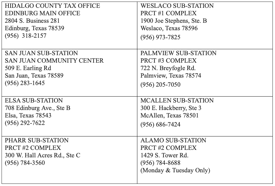 For more information, please visit the Hidalgo County website: www.hidalgocountytax.org or call our Edinburg Main Office at (956) 318-2157.