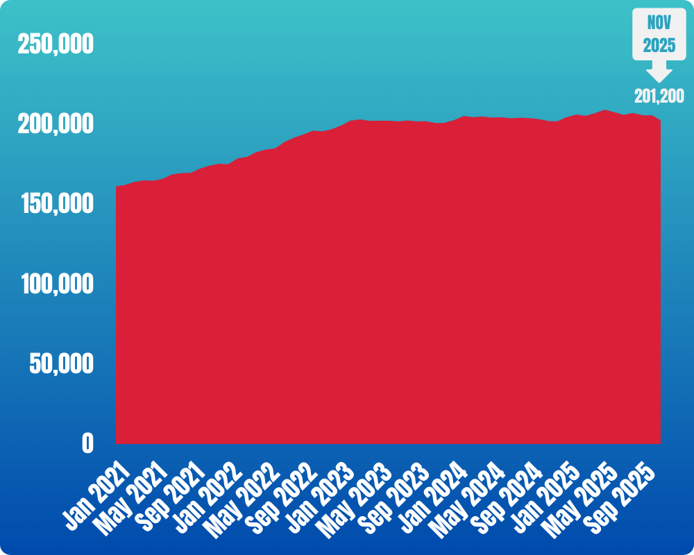 Through November 2025, upstream employment totaled 201,200 jobs. While employment declined by 3,500 jobs in November compared with October, year-to-date employment was little changed, with a net gain of 300 direct upstream jobs. Employment was also modestly higher than a year earlier, rising by 100 jobs, or 0.1 percent.