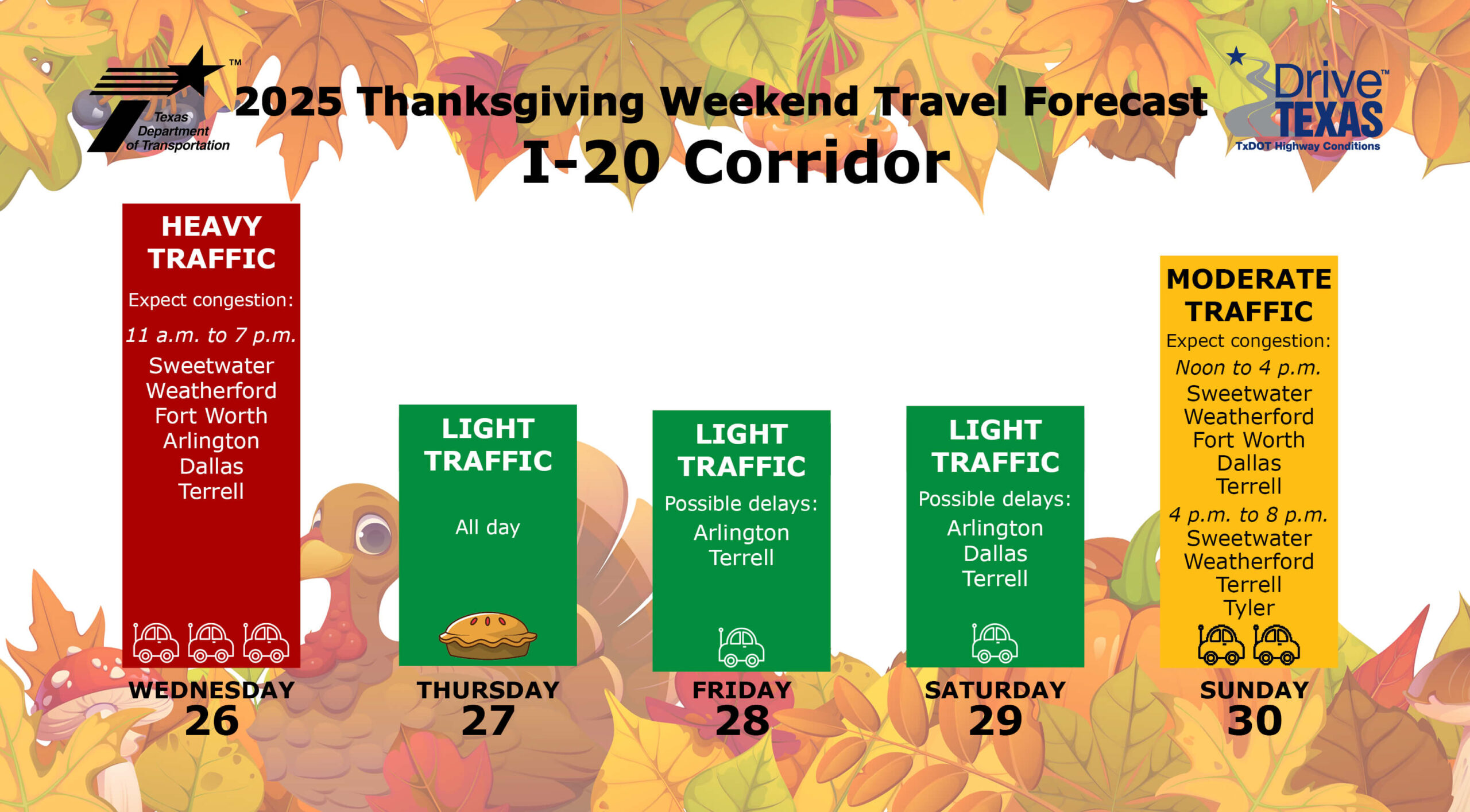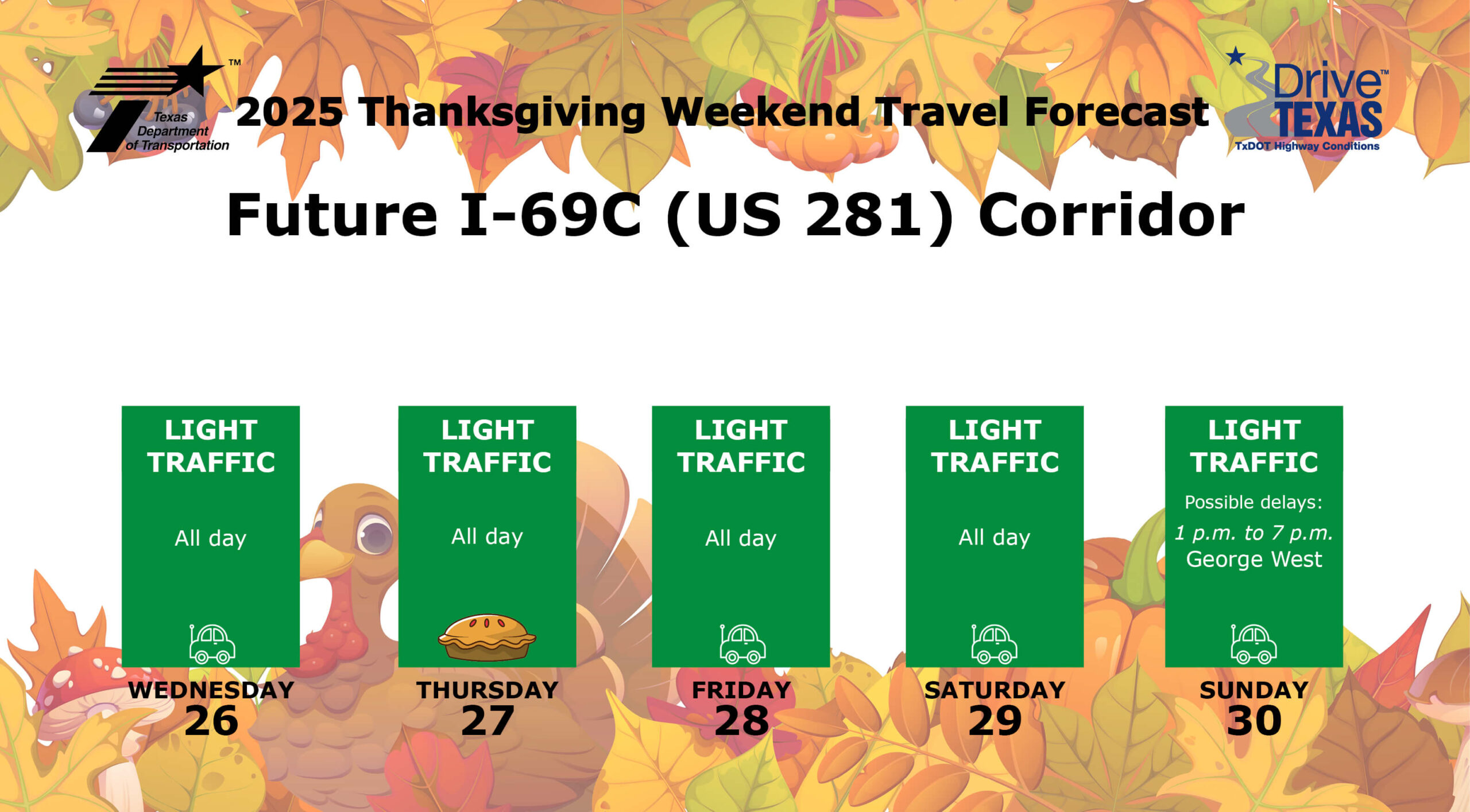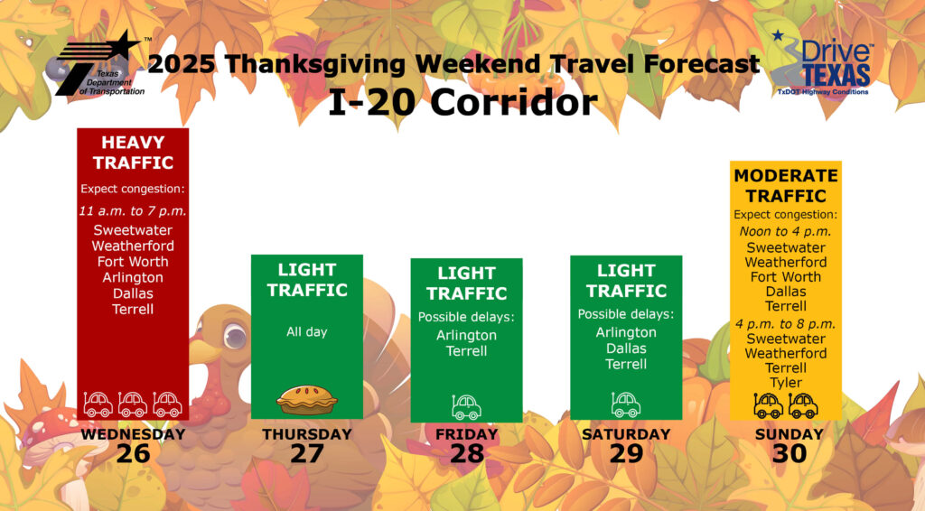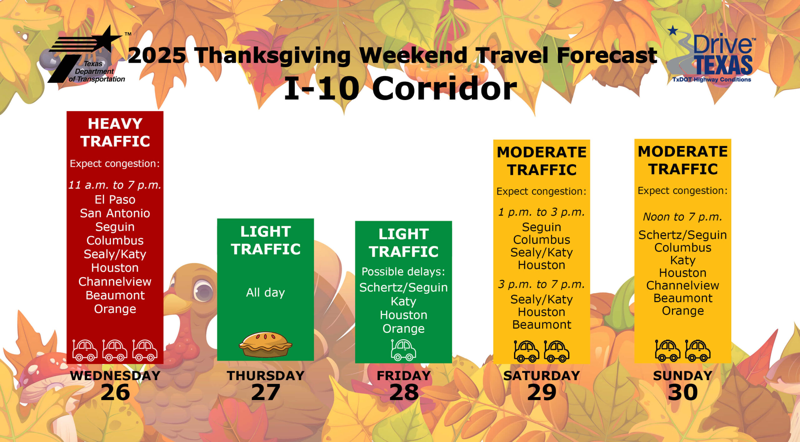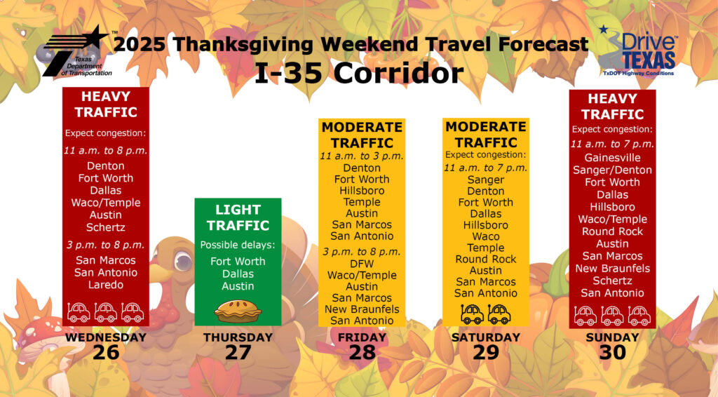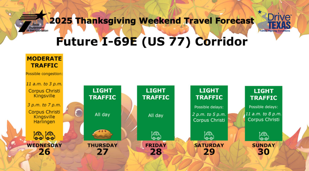 PHARR, Texas – TxDOT has released the Texas Thanksgiving highway travel forecast. If you are hitting the road this holiday weekend, pick an ideal time to avoid the heavy travel times. Stay safe on the road and have a Happy Thanksgiving.