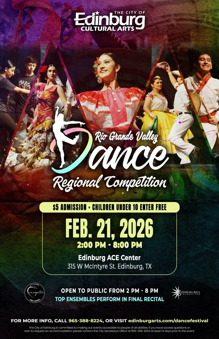 The City of Edinburg’s Cultural Arts Division and Conceptos Dance Ensemble will present the 2026 Rio Grande Valley Dance Regional Competition, Saturday, February 21, 2026, from 2:00 PM to 8:00 PM at the Edinburg Arts, Culture, and Events (ACE) Center. This public event will showcase traditional and contemporary dance performances by talented students from across the Rio Grande Valley, celebrating the region’s rich cultural heritage.