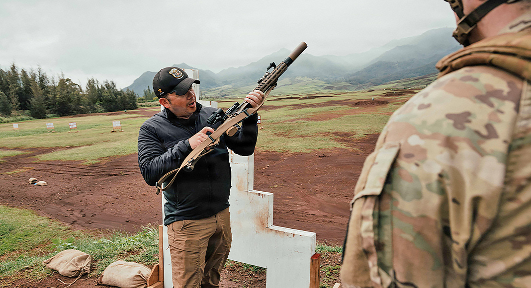 Army Sgt. 1st Class Chuck Riegel, a U.S. Army Marksmanship Unit instructor, demonstrates shooting procedures on the M7 rifle to soldiers assigned to the 25th Infantry Division at Schofield Barracks, Hawaii, Jan. 21, 2026. Image: Army Sgt. 1st Class Timothy Hamlin, U.S. Army Marksmanship Unit via Us Department of war