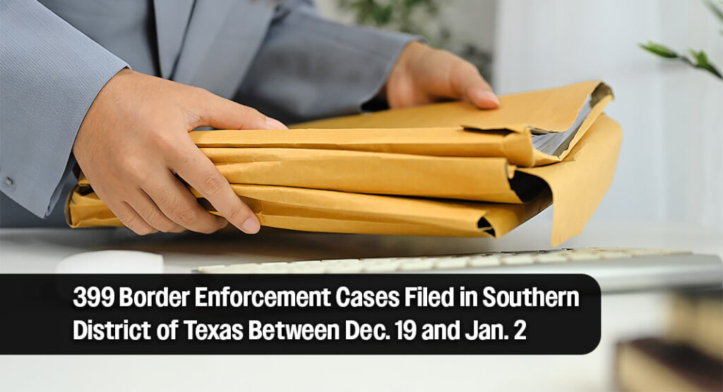 HOUSTON – A total of 399 cases have been filed related to border enforcement efforts in the Southern District of Texas from Dec. 19 – Jan 2.