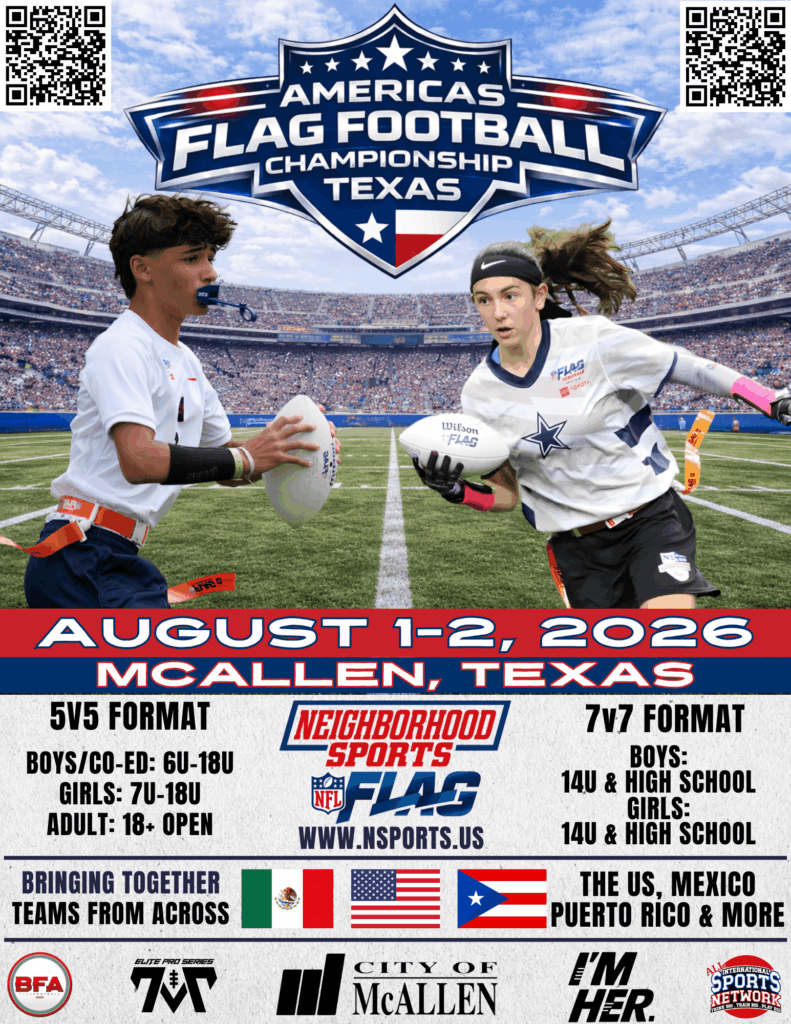 “This championship is the first of its kind to be held in the region and it will bring together athletes and families from across the nation, Mexico and Puerto Rico, and we couldn’t be more excited,” said Mayor Javier Villalobos. “McAllen offers a warm welcome, a safe and vibrant environment, and a sense of home for everyone who comes to compete and celebrate flag football.”