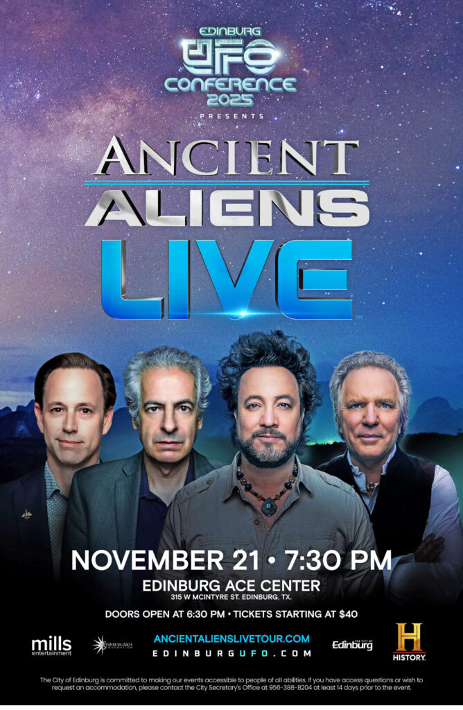 EDINBURG, Texas – The City of Edinburg is pleased to announce that the Ancient Aliens Live Tour will headline this year’s annual UFO Festival, taking place Friday, November 21, 2025, from 6:30 p.m. to 9 p.m. at the Edinburg Arts, Culture & Events Center.