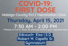 Hidalgo County and Hidalgo County Precinct 1 Commissioner’s Office, in partnership with Edcouch-Elsa Independent School and several other partners in the Delta area, will be hosting another first-dose COVID-19 community vaccine clinic on Thursday, April 15, 2021