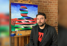 Bold blocks of color fill in most of an outline of artist Alejandro “Alex” Macias.