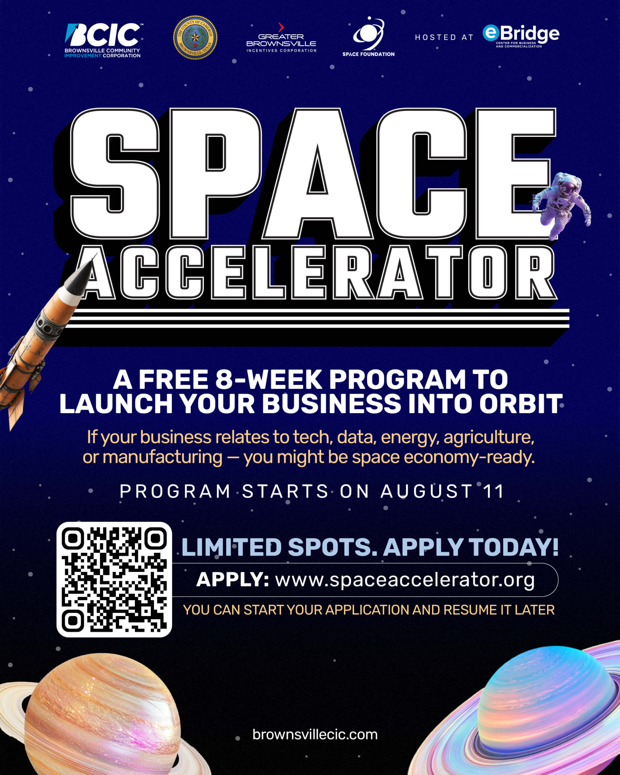 BROWNSVILLE, Texas – The Brownsville Community Corporation (BCIC) is proud to announce the launch of a new Space Accelerator Program in collaboration with the Space Foundation. This initiative is made possible through key partnerships with Cameron County, the Greater Brownsville Incentives Corporation (GBIC) and Space Foundation. Set to begin in August, the 8-week accelerator aims to support local startups and businesses with ties to the growing space economy. The program will equip a cohort of 8-10 companies with the tools, mentorship, and resources needed to scale their ventures. Participants will also learn how to apply for federal funding, like SBIR/STTR grants, and build long-term success in the space industry.
