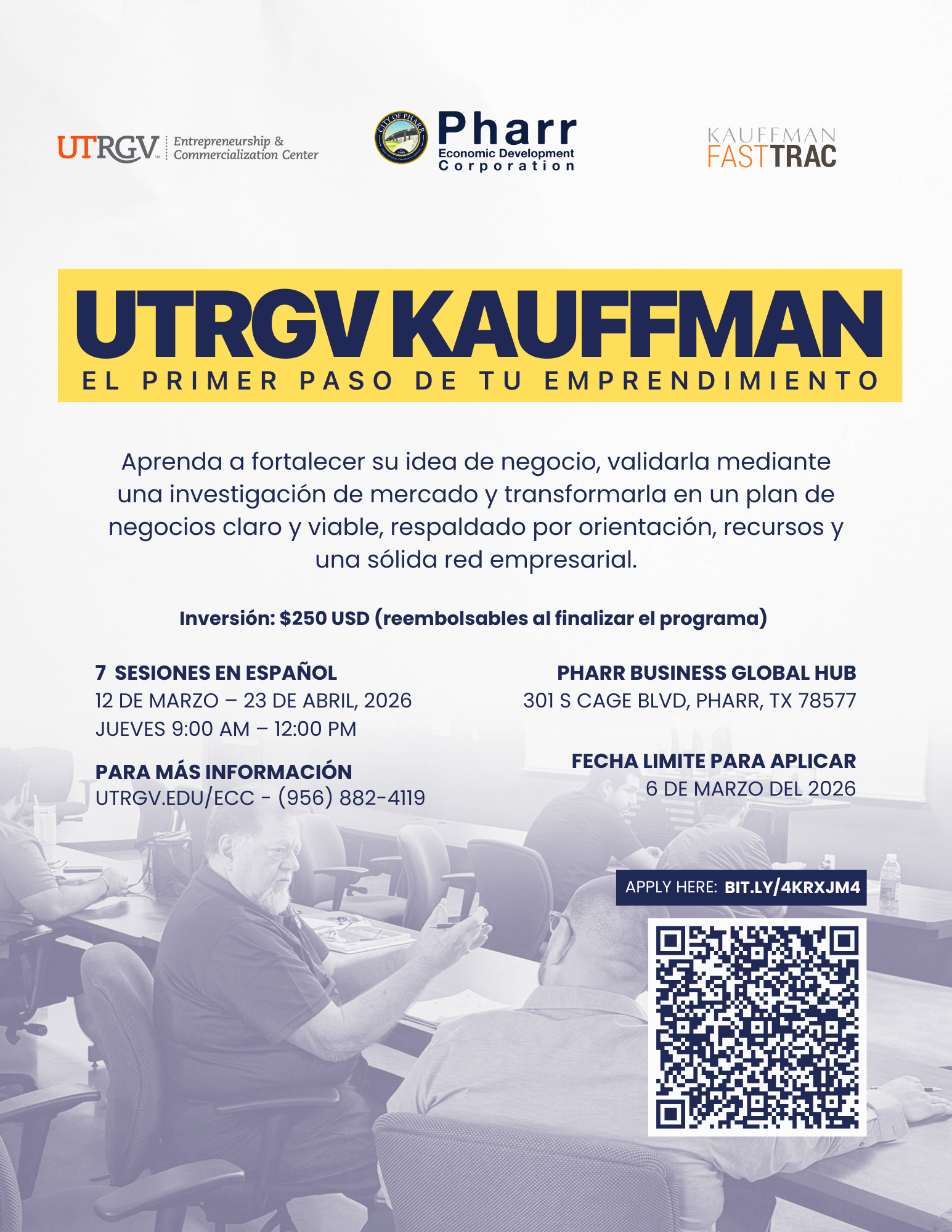 In partnership with the UTRGV Entrepreneurship and Commercialization Center (ECC), the Pharr Economic Development Corporation (Pharr EDC) proudly supports this initiative, reinforcing its commitment to fostering local business growth and innovation throughout the region.