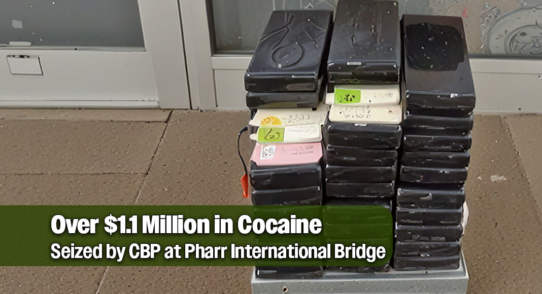 On April 15, CBP officers at the Pharr International Bridge cargo facility encountered a commercial tractor trailer hailing an empty trailer that arrived from Reynosa, Mexico. The vehicle was referred to the secondary inspection dock for further inspection utilizing nonintrusive inspection equipment and screening from a canine team. Physical inspection led to the discovery of 32 packages of suspected cocaine with a combined weight of 83.24 pounds (37.76 kg) concealed within the trailer floor. The cocaine has an estimated street value of $1,111,503.