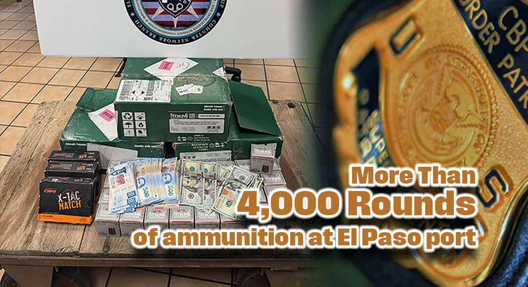 EL PASO, Texas — U.S. Customs and Border Protection Mobile Enforcement Team members performing southbound inspections at the Bridge of the Americas international crossing seized 4,030 rounds of ammunition, $1,203 in U.S. currency, and $906 in Mexican pesos May 1. A 33-year-old male U.S. citizen was arrested in the case.