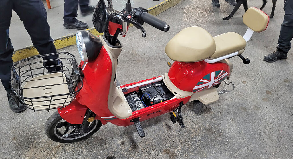 A CBP drug sniffing dog searched the conveyance and alerted to the scooter. A nonintrusive, Z-Portal scan of the vehicle also indicated anomalies in the battery compartment.