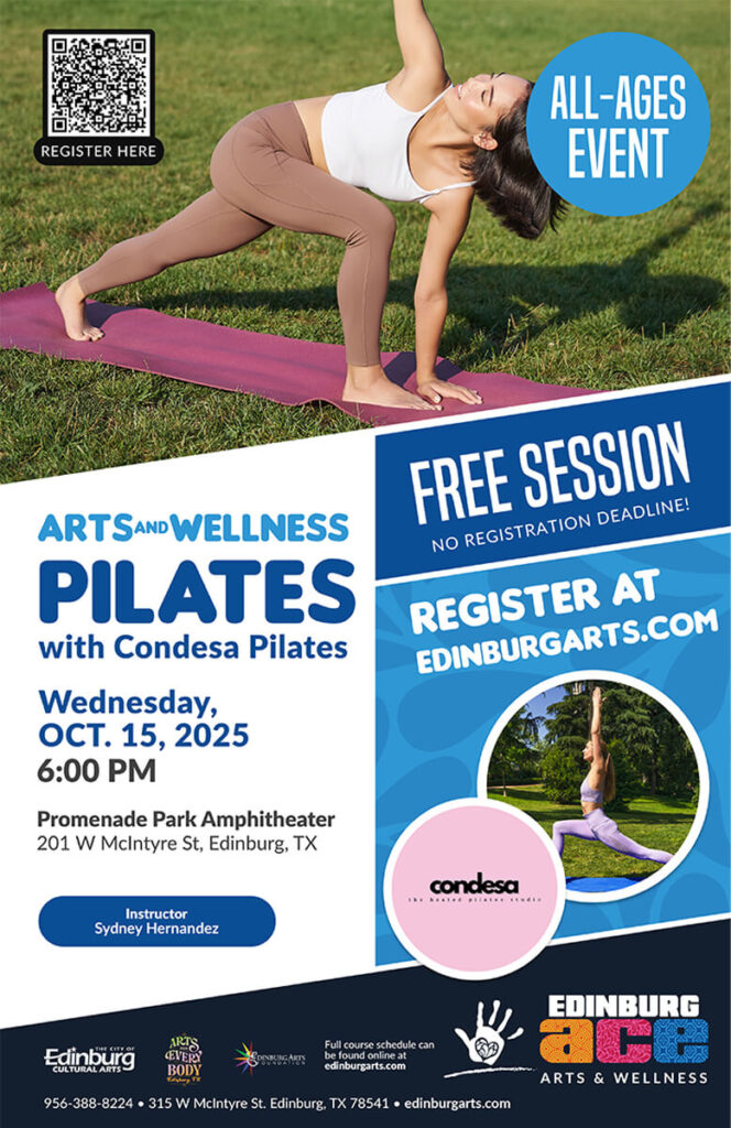 The Pop-Up Pilates session is one of several programs organized by the City of Edinburg’s Cultural Arts Division. For more information, visit the Edinburg Arts, Culture, and Events Center at 315 W. McIntyre St., call (956) 388-8224, email arts@cityofedinburg.com, or visit edinburgarts.com.