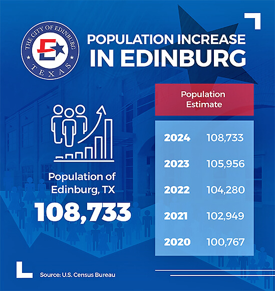 EDINBURG, Texas – The City of Edinburg is once again making headlines as one of the fastest-growing cities in America, according to the latest 2024 population estimates released by the U.S. Census Bureau. Edinburg’s population rose from 105,956 in 2023 to 108,733 in 2024—an increase of 2.62%. This surge places Edinburg 25th in the nation for fastest percentage growth among cities with populations of 100,000 or more, and 10th in the state of Texas. The city also stands out as the fastest-growing municipality in the Rio Grande Valley.