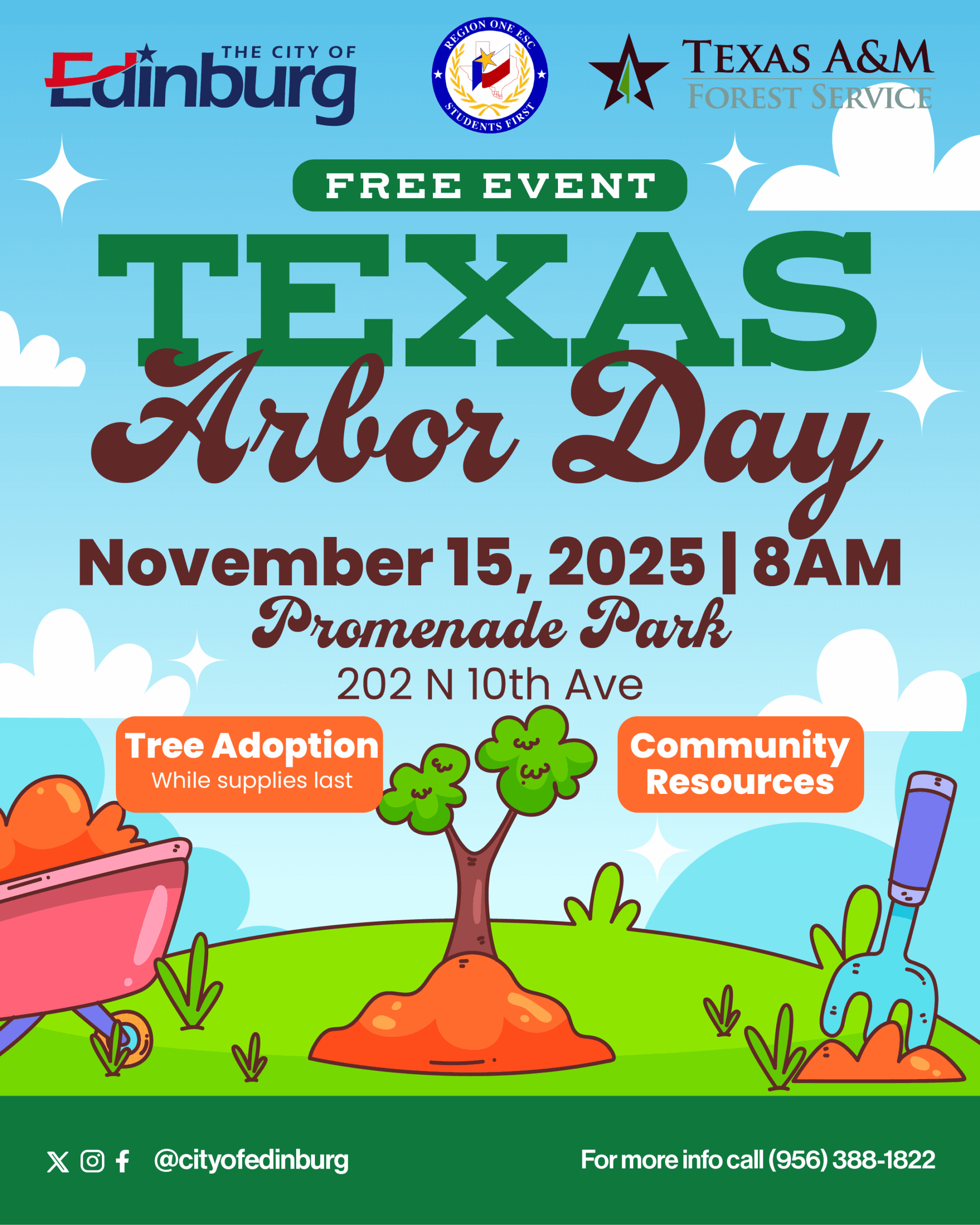 EDINBURG, Texas – In recognition of Texas Arbor Day, the City of Edinburg is encouraging the community to attend its tree adoption event on Saturday, November 15, 2025. The Texas Arbor Day Celebration kicks off at 8 a.m. at Promenade Park, located at 202 N. 10th Avenue.
