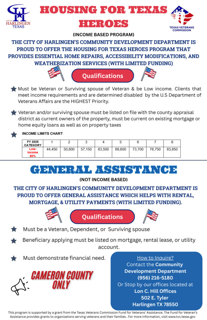 HARLINGEN, Texas — The City of Harlingen’s Community Development Department is proud to announce expanded assistance for local veterans through funding from the Texas Veterans Commission Fund for Veterans’ Assistance (FVA). The grant supports two key programs; Housing for Texas Heroes and General Assistance, that provide housing repairs and financial relief to eligible veterans, dependents, and surviving spouses in Cameron County.