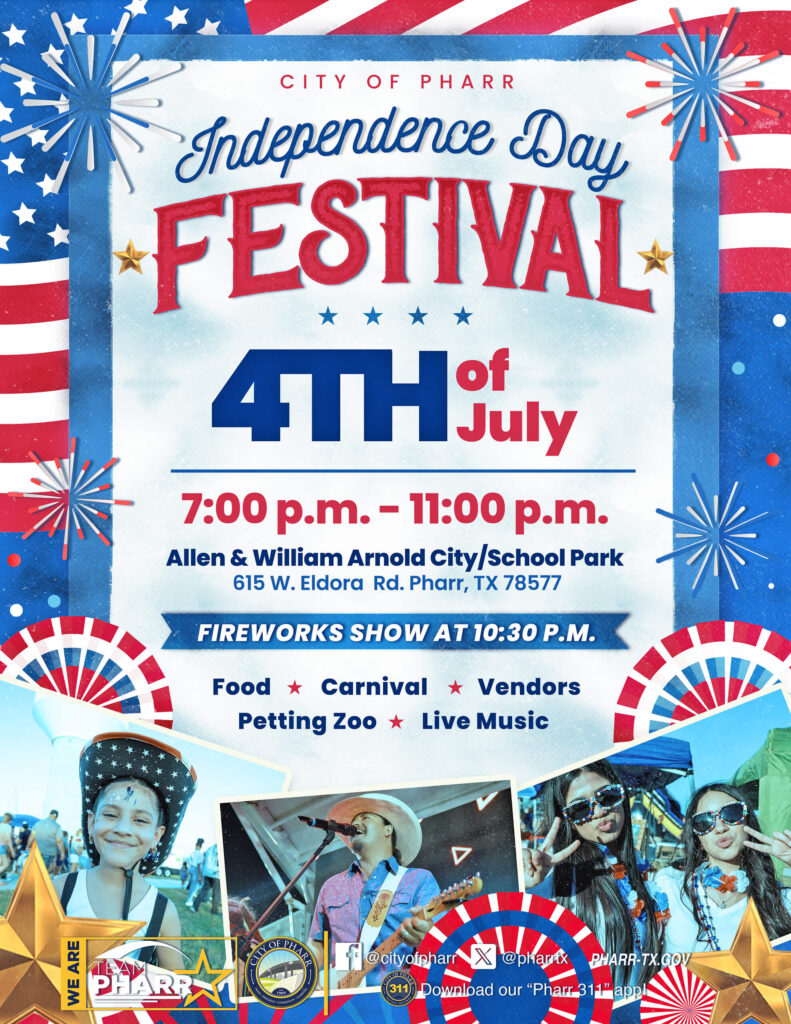 | DETAILS WHAT: City of Pharr Independence Day Festival WHERE: Allen & William Arnold City/School Park located (615 W Eldora Rd, Pharr, TX 78577) WHEN: Thursday, July 4, 2024, 7 pm – 11 pm FIREWORKS SHOW: 10 pm |
