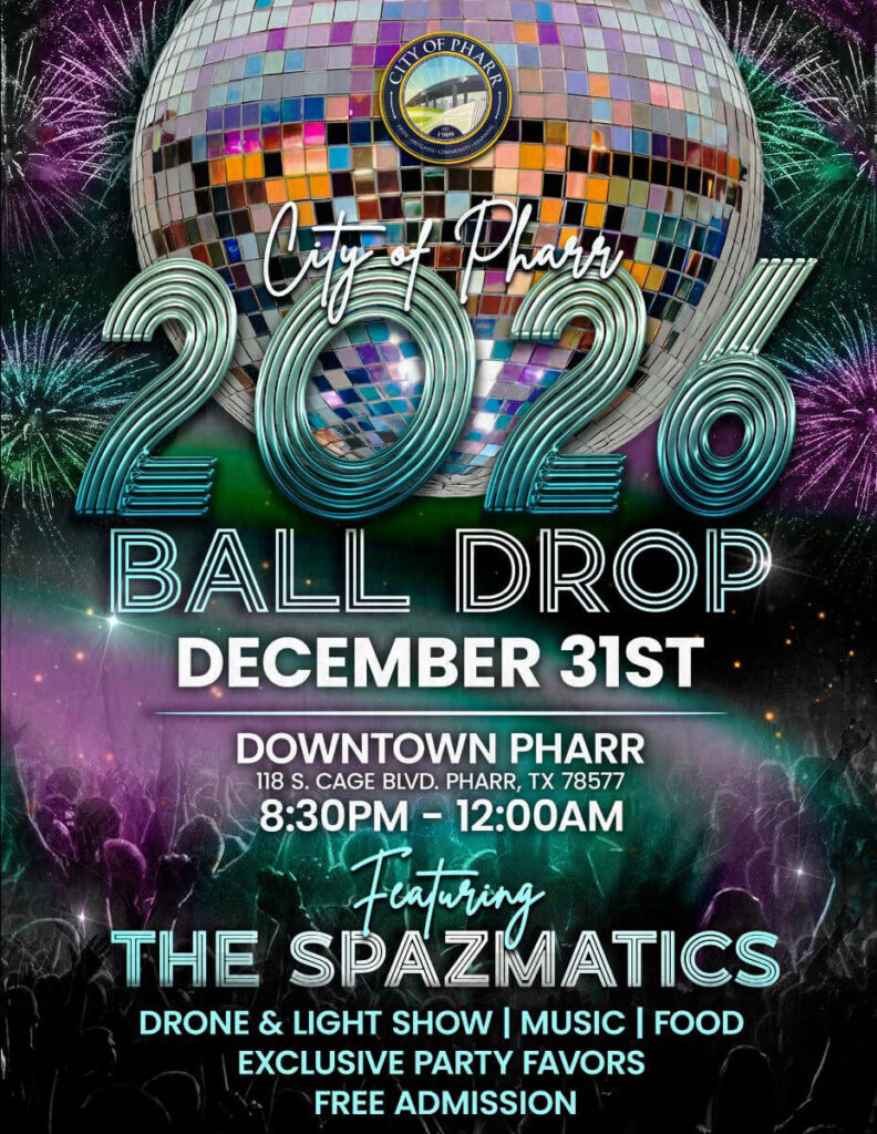 PHARR, Texas – The City of Pharr invites the community to ring in the New Year at its annual New Year’s Eve Ball Drop celebration in Downtown Pharr. This exciting event will take place on Wednesday, December 31, 2025, from 8:30 PM to 12:00 AM at 118 S. Cage Blvd.