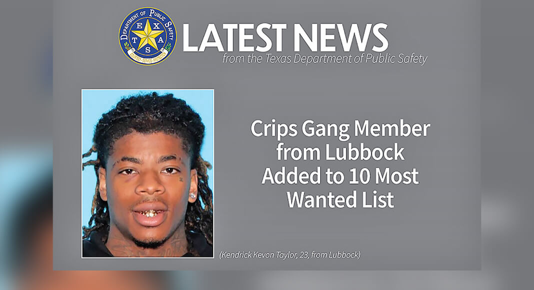 AUSTIN – The Texas Department of Public Safety (DPS) has added Kendrick Kevon Taylor – a known Crips gang member who was out on parole – to the Texas 10 Most Wanted Fugitives List after the fatal shooting of an 18-year-old male in Lubbock last month. Texas Crime Stoppers is now offering a cash reward of up to $7,500 for information leading to his arrest. All tips are guaranteed to be anonymous.