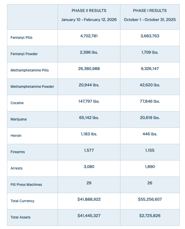 LOS ANGELES –Marking a powerful start to 2026, the U.S. Drug Enforcement Administration dealt a significant blow to drug trafficking networks during Phase II of Operation Fentanyl Free America. Between January 12 and February 10, 2026, DEA seized more than 4.7 million fentanyl pills and nearly 2,396 pounds of fentanyl powder resulting in more than 57 million deadly doses of fentanyl removed from communities in just thirty-days.