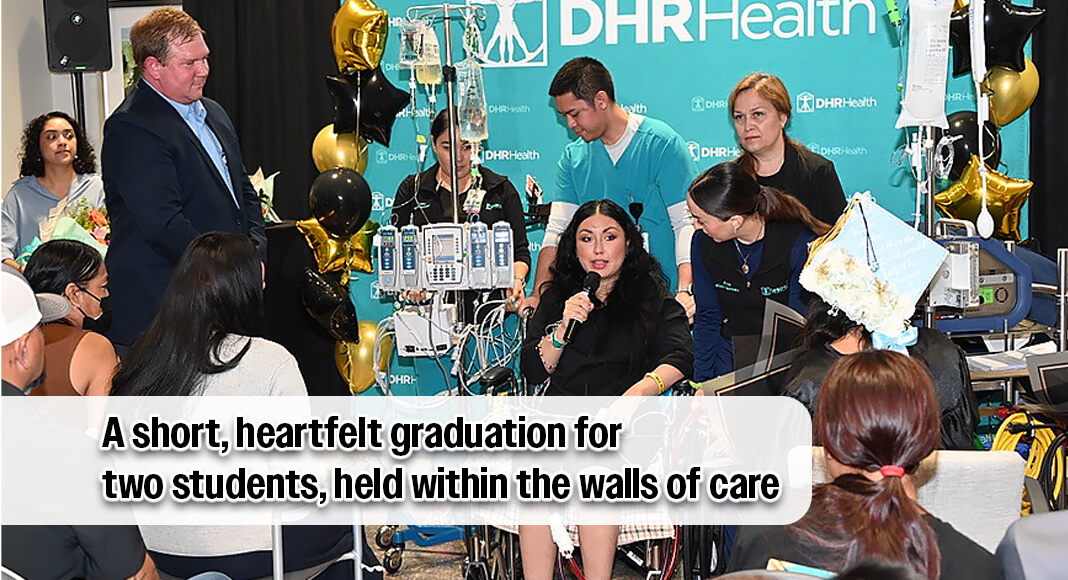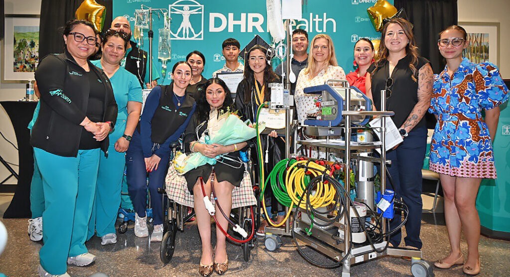 DHR Health hosted a deeply moving graduation ceremony for the children of Bobbie Adame, a patient currently receiving advanced life support through ECMO (Extracorporeal Membrane Oxygenation). Bobbie, hospitalized and unable to attend her children’s official ceremonies, watched proudly as her daughter Kaylynn and son Robert celebrated their academic milestones in her presence, surrounded by family, medical professionals, and community leaders.