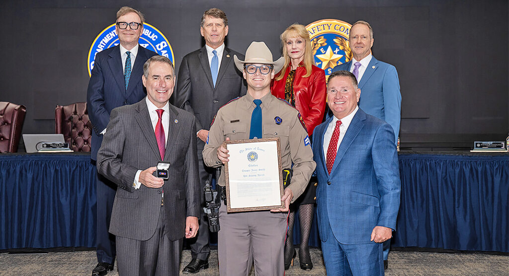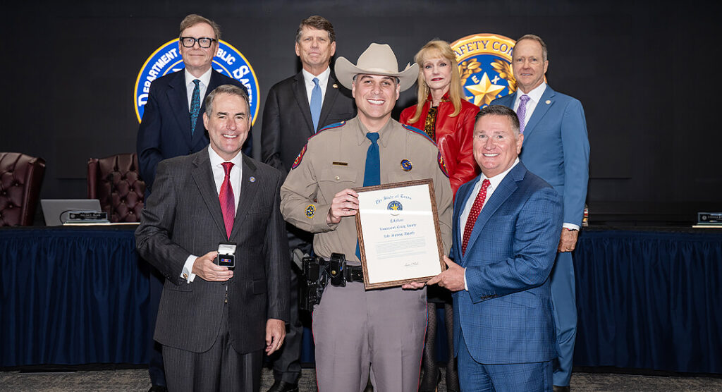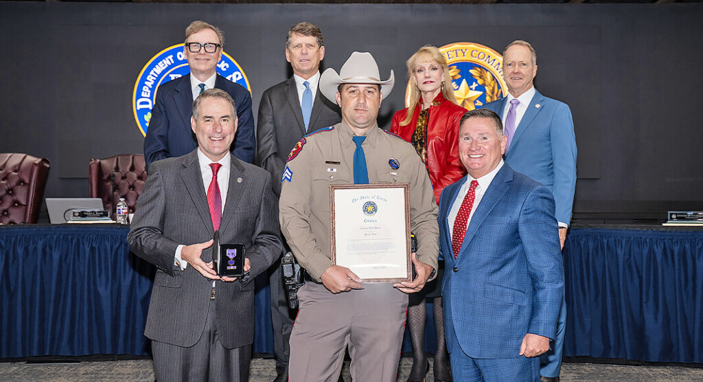 AUSTIN – Several Texas Department of Public Safety (DPS) personnel were honored during the December Public Safety Commission meeting held at the new Legacy Hall at DPS Headquarters in Austin. PSC Chairman Steven P. Mach, Nelda Luce Blair, Dan Hord, Larry Long and Steven Stodghill, along with DPS Colonel Freeman F. Martin, presented two Purple Hearts, four Lifesaving Awards and one Unit Citation. One Director’s Award was also given to someone outside the department.