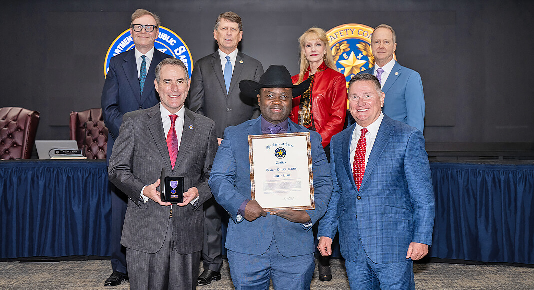 AUSTIN – Several Texas Department of Public Safety (DPS) personnel were honored during the December Public Safety Commission meeting held at the new Legacy Hall at DPS Headquarters in Austin. PSC Chairman Steven P. Mach, Nelda Luce Blair, Dan Hord, Larry Long and Steven Stodghill, along with DPS Colonel Freeman F. Martin, presented two Purple Hearts, four Lifesaving Awards and one Unit Citation. One Director’s Award was also given to someone outside the department.
