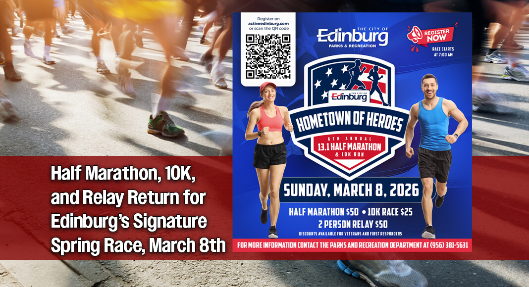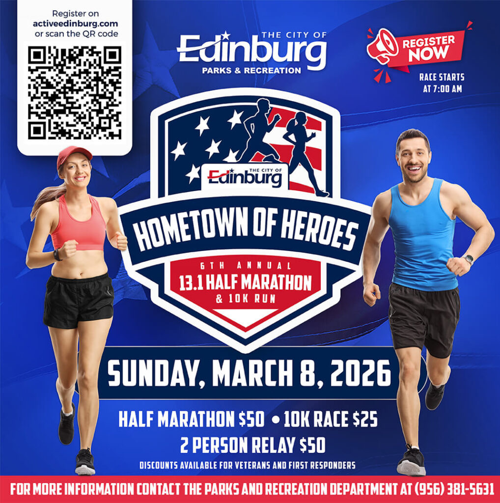 EDINBURG, Texas – The City of Edinburg is proud to announce the highly anticipated 5th Annual Hometown of Heroes Half-Marathon, set to take place on Sunday, March 8, at 7:45 a.m. This year’s event will feature a 10K, a Half-Marathon, and a Two-Person Relay.