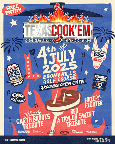 EDINBURG, Texas – The Edinburg Chamber of Commerce is proud to announce the return of Texas Cook’Em: High Steaks in Edinburg, set to take place on Friday, July 4, 2025, at the Ebony Hills Golf Course. This annual free Independence Day event is expected to be the biggest and most exciting yet, featuring a full day of live entertainment, family-friendly attractions, and one of Texas’ premier steak BBQ cook-offs.