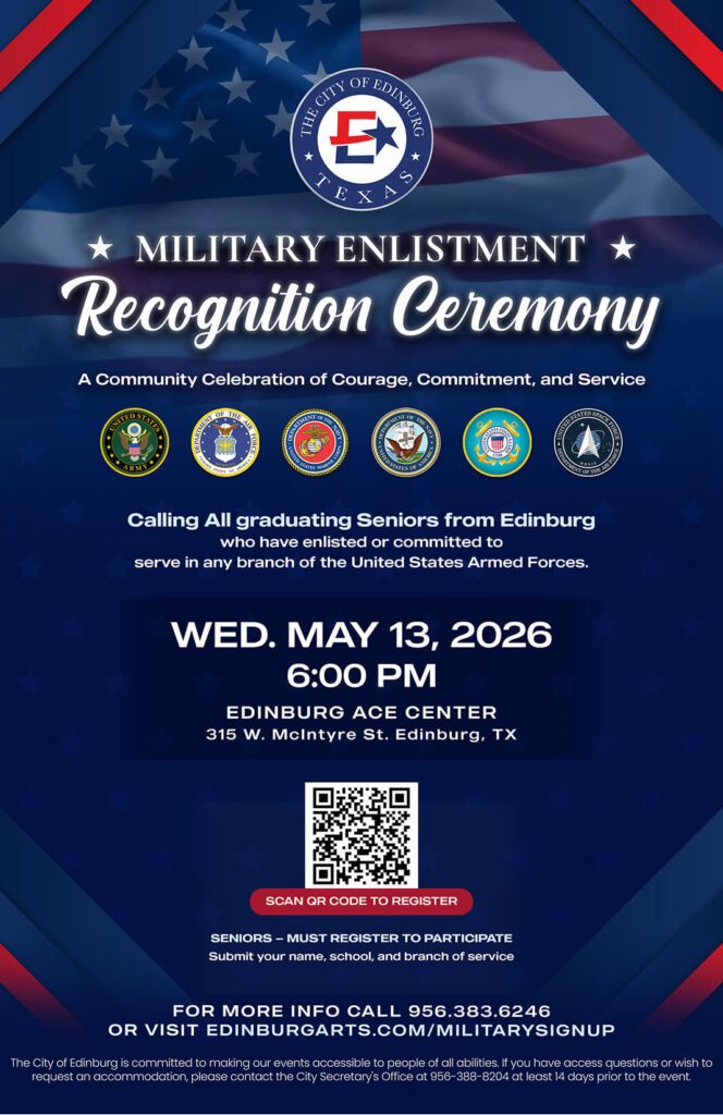 EDINBURG, Texas – The City of Edinburg Cultural Arts Department, in partnership with the Veterans Committee, invites graduating high school seniors in Edinburg who have committed to serving in the United States Armed Forces to register for the Military Enlistment Recognition Ceremony on Wednesday, May 13, at 6 p.m. at the Edinburg Arts, Culture & Event (ACE) Center, located at 315 W. McIntyre St.