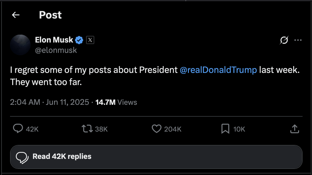 While Musk did not specify which posts he was referring to, the admission was interpreted as a notable change in tone, especially given his frequent use of social media to comment on political figures and policies. Observers noted the gesture as rare, coming from a figure often characterized by a confrontational or unapologetic online presence.