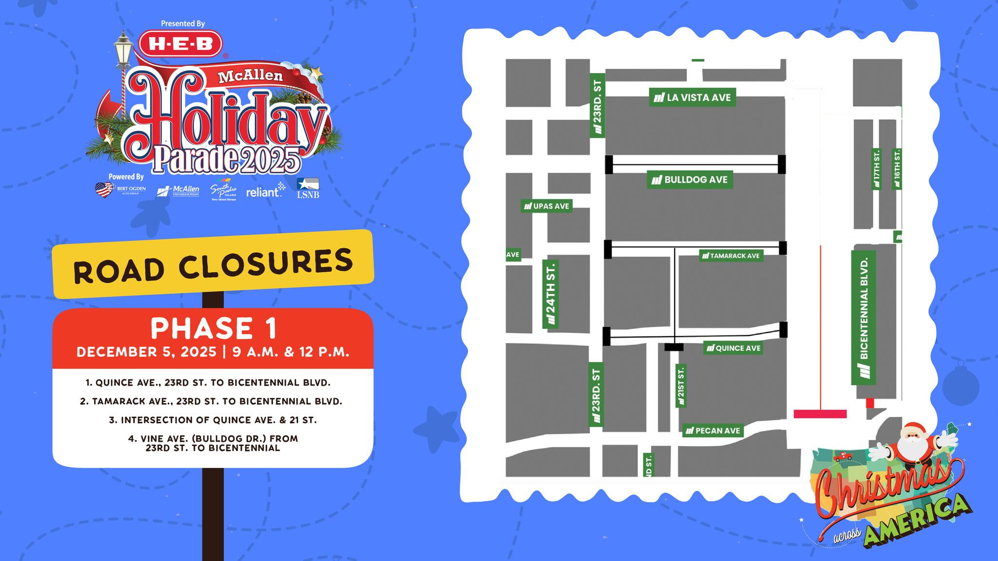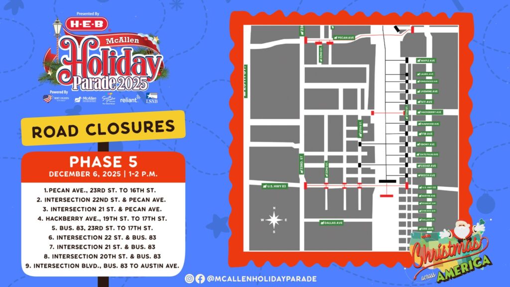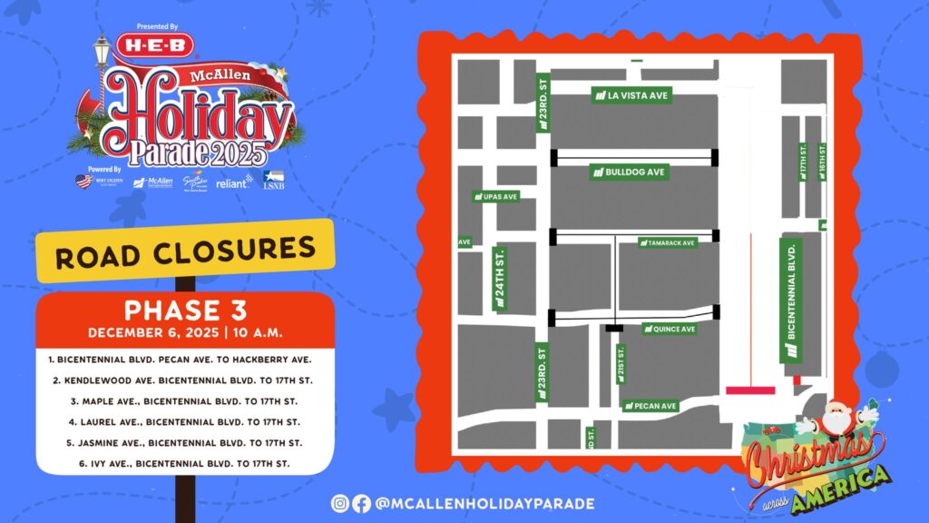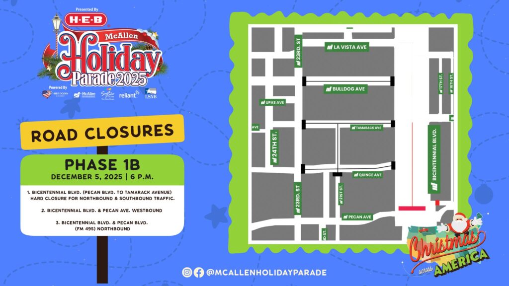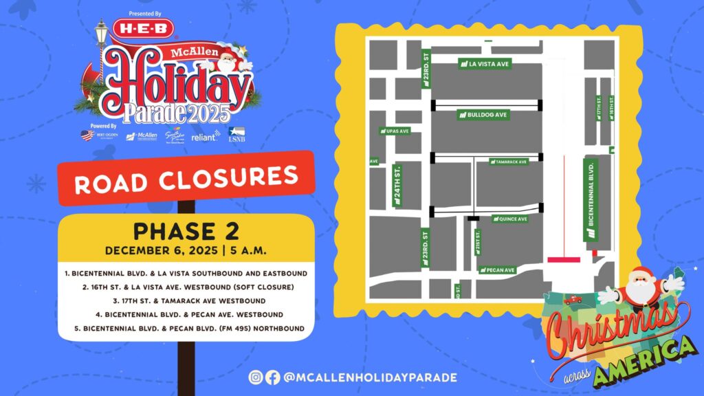 As the City of McAllen prepares for the 2025 McAllen Holiday Parade, presented by H-E-B and powered by Bert Ogden Auto Group, residents are reminded that continued lane and road closures along Bicentennial Blvd., from La Vista Avenue to Pecan Blvd., are necessary between now and Saturday to ensure a safe and successful event.