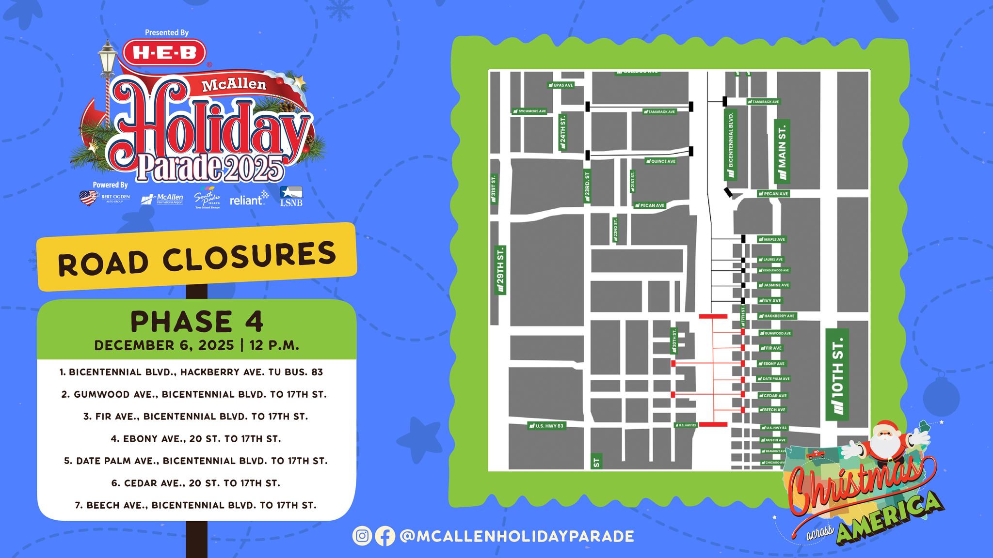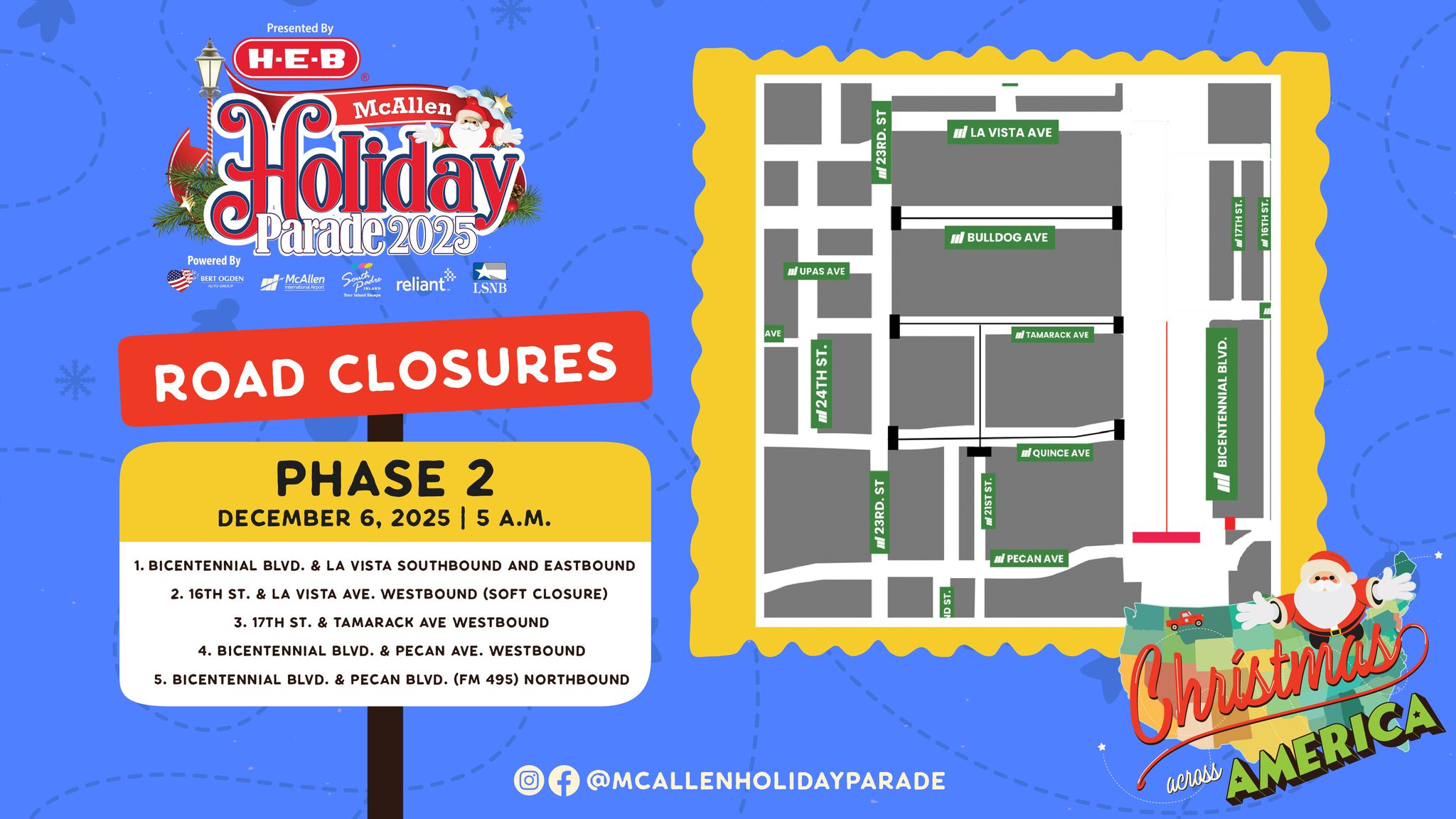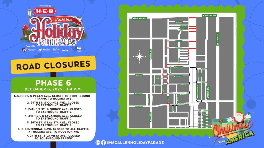 As the City of McAllen prepares for the 2025 McAllen Holiday Parade, presented by H-E-B and powered by Bert Ogden Auto Group, residents are reminded that continued lane and road closures along Bicentennial Blvd., from La Vista Avenue to Pecan Blvd., are necessary between now and Saturday to ensure a safe and successful event.