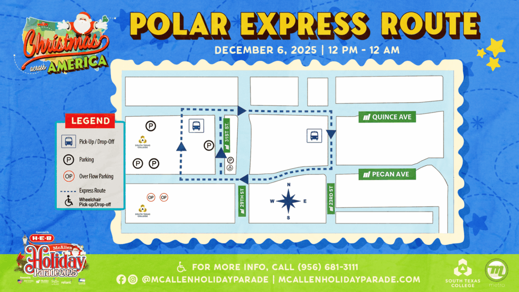 Visitors attending Christmas in the Park and the McAllen Holiday Parade are encouraged to use the free Polar Express Park & Ride, operating from 12:00 p.m. to 12:00 a.m. midnight on Saturday, December 6, 2025. Guests can park at South Texas College on Pecan Blvd. and ride the City of McAllen Polar Express buses, which will drop off attendees along 23rd Street at Quince Avenue. Strollers, wheelchairs, and service animals are welcome.