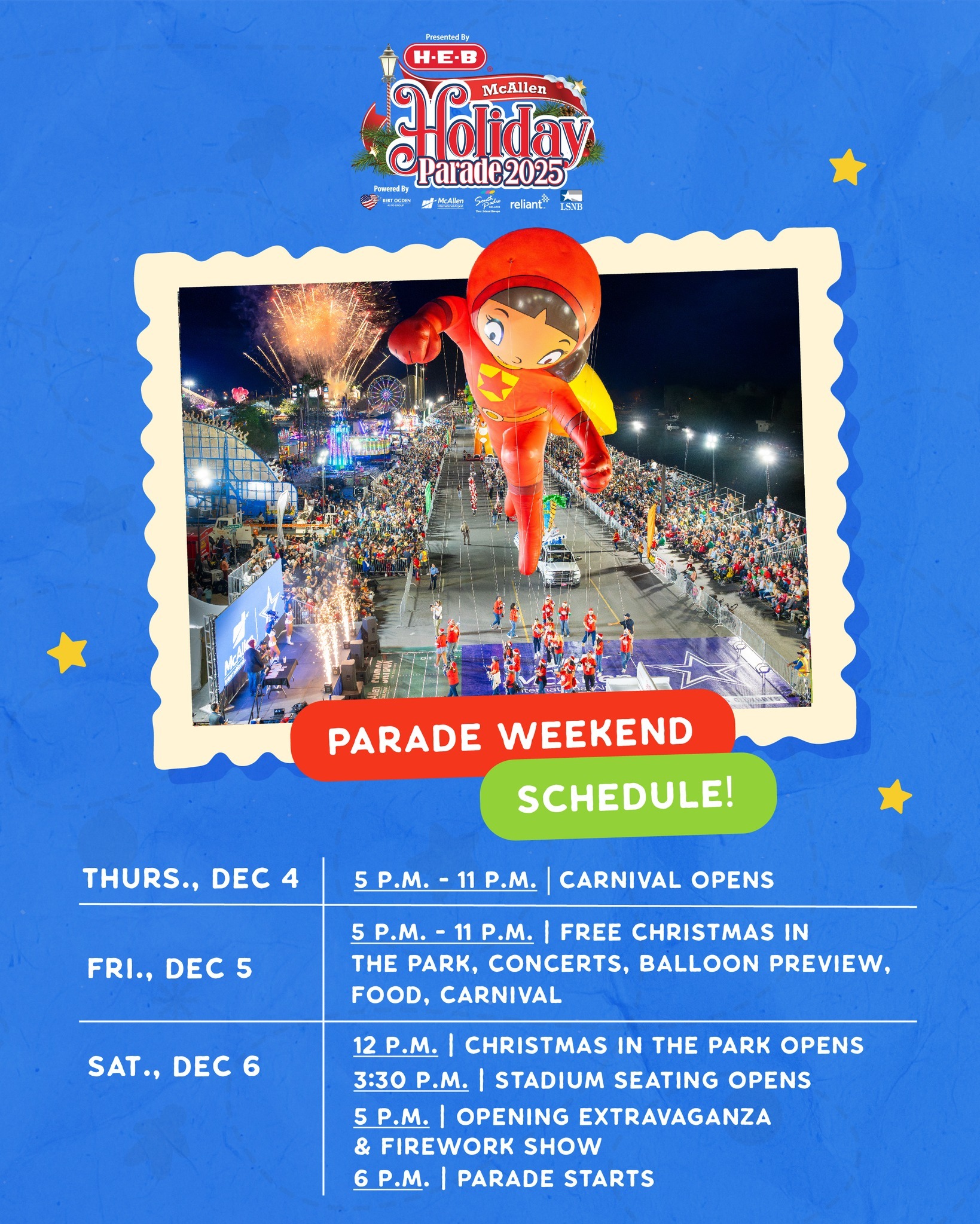The City of McAllen thanks all residents and visitors for their patience and support as we prepare to welcome thousands to the largest and most spectacular holiday parade in the region. We look forward to celebrating safely and joyfully with our community.