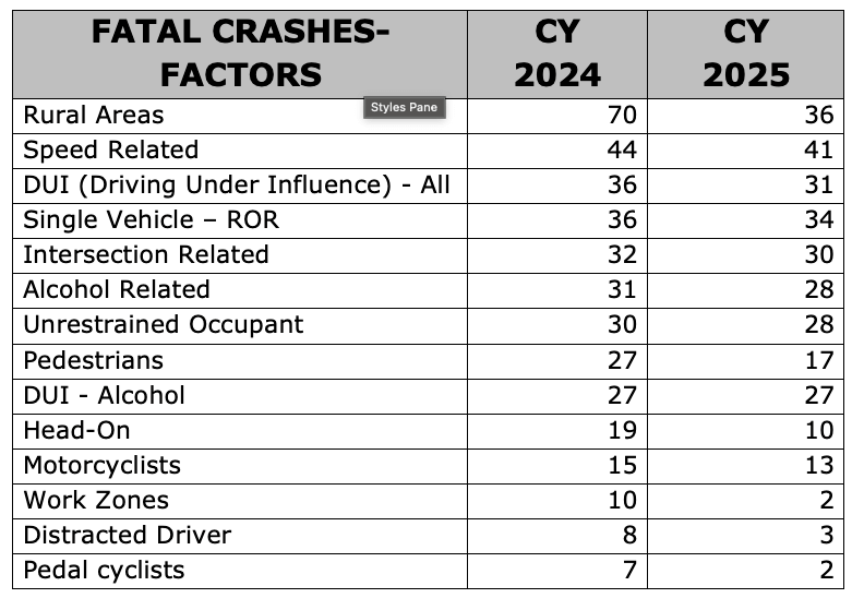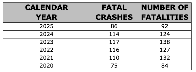A total number of 86 fatal crashes resulting in 92 fatalities were recorded in 2025, compared to the 114 fatal crashes and 124 fatalities recorded in 2024. The numbers represent 32 fewer fatalities and the fewest number of lives lost in roadway crashes in the past five years.