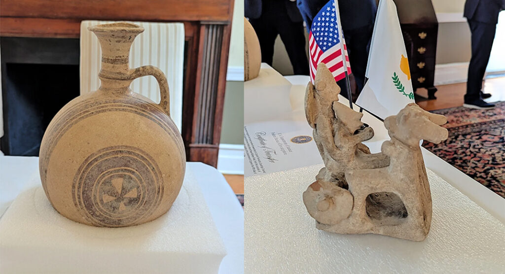 The FBI, working closely with the Cypriot government and the Department of Justice Office of International Affairs, as well as cooperation from an art gallery in New York, returned two ancient Cypriot artifacts during a repatriation ceremony at the Embassy of Cyprus in Washington, D.C., on August 4, 2025. The artifacts consist of a terracotta quadriga chariot sculpture and a biochrome flask, each estimated to be over 2,600 years old.