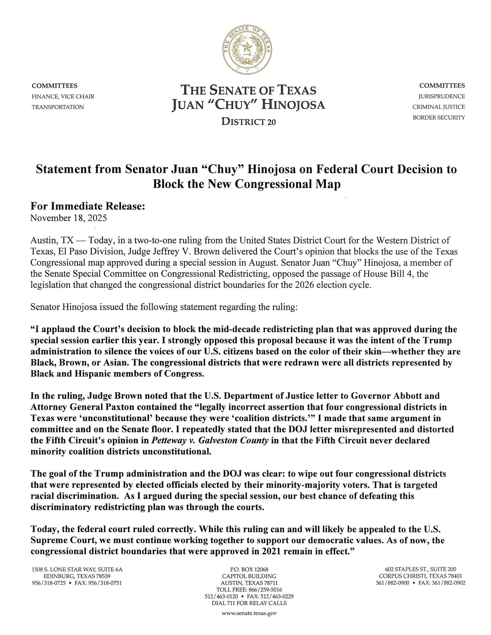 In a two-to-one decision issued November 18, 2025, Judge Jeffrey V. Brown of the U.S. District Court for the Western District of Texas ruled that the state could not implement the 2025 mid-decade congressional redistricting plan. “I applaud the Court’s decision to block the mid-decade redistricting plan that was approved during the special session earlier this year,” Hinojosa said in a statement. He added that he “strongly opposed this proposal because it was the intent of the Trump administration to silence the voices of our U.S. citizens based on the color of their skin—whether they are Black, Brown, or Asian.”