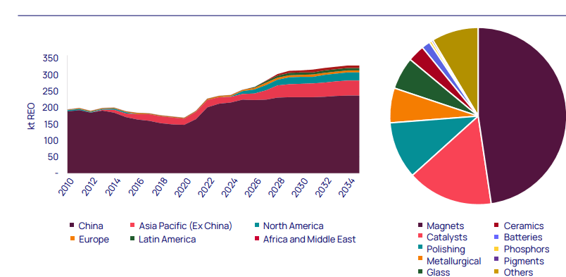 Rare earth elements refined supply outlook (left) and rare earth applications (right)