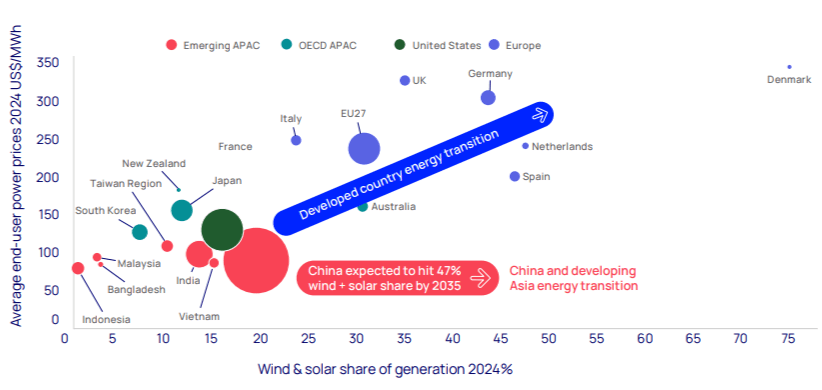 - Europe’s economic disadvantage due to high power prices is apparent in a chart mapping national power prices against wind/solar generation share. China, conversely, has very competitive power prices and with 47% of its power generation forecast to come from wind and solar by 2035, combined with its dominance of the renewable’s technology supply chain, power prices are expected to remain low.