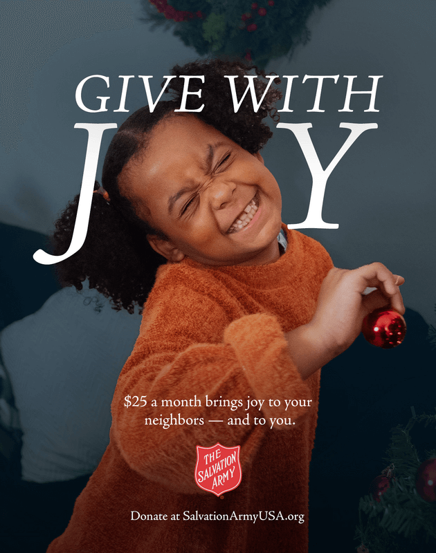 While many people in our communities are silently battling hunger, homelessness, and hardship, we can find hope in the fact that giving is a source of joy for all. The Salvation Army’s recently released national campaign encourages people to Give with Joy and uplift families in need by helping provide shelter, food, bill assistance and more. Your generosity offers joyful reassurance that even during our most challenging times, we are not alone.