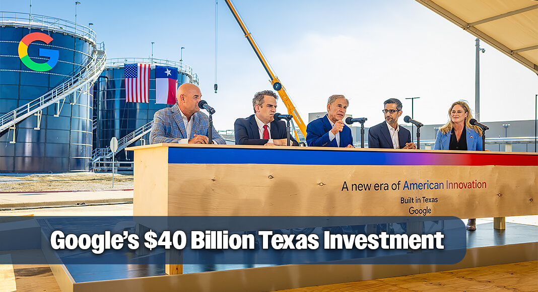 Google’s $40 billion investment in Texas as part of Google’s “Investing in America” initiative. The investment will boost cloud and artificial intelligence (AI) infrastructure, with the development of data center facilities, programs to strengthen energy capacity and affordability, and workforce training in the state. This is Google’s largest investment in any state in the U.S.