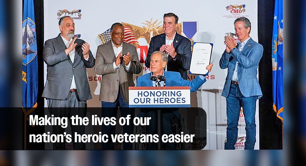 HOUSTON – Governor Greg Abbott ceremonially signed Senate Bill 1814, Senate Bill 1818, and House Bill 114 to make the lives of our nation’s heroic veterans easier.