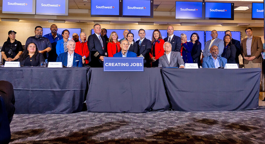 AUSTIN — Governor Greg Abbott, Southwest Airlines, and Austin Mayor Kirk Watson announced at Austin-Bergstrom International Airport (AUS) that Southwest will establish a new pilot and flight attendant crew base in Austin. Southwest’s expansion will lay the groundwork for future operational growth in the state and is expected to create 2,000 jobs in Austin by mid-2027. A Texas Enterprise Fund (TEF) grant of $14 million has been extended to Southwest Airlines. In addition, the company has been offered a $375,000 Veteran Created Job Bonus.
