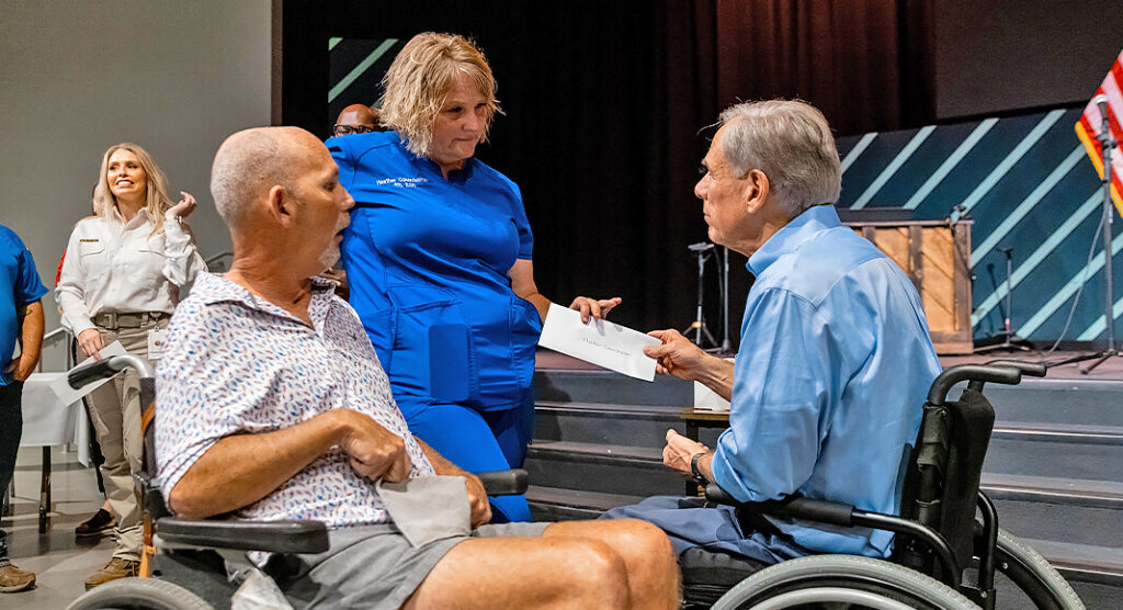 “We know you’ve been challenged in extraordinary ways,” said Governor Abbott. “We want to be able to be a part of the process, not just now but in an ongoing way, to help you respond to those challenges. The financial assistance you leave with today will help you deal with the devastation left behind by the flooding. Our hope is that this check will assist you all in a meaningful way in the rebuilding process.”