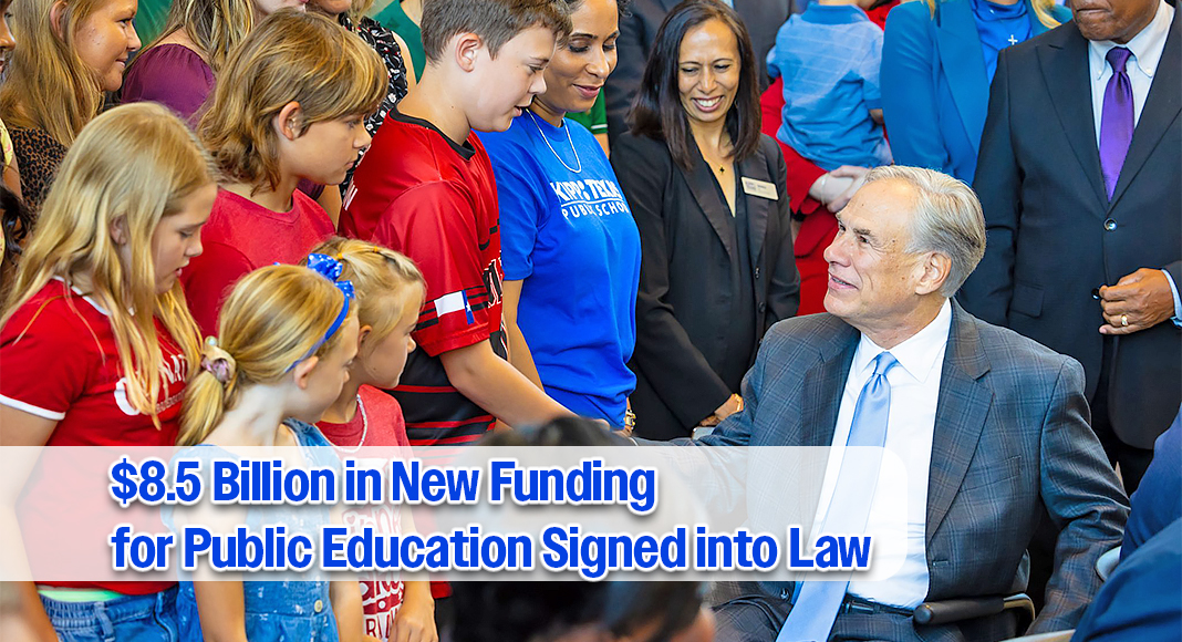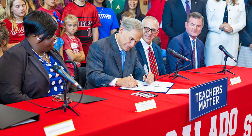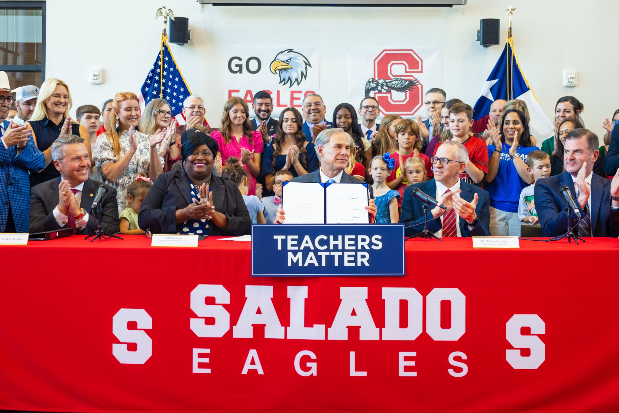Governor Greg Abbott signed House Bill 2 into law to provide a record $8.5 billion in new funding for public education and a historic $4 billion for teacher and staff pay raises during a bill signing ceremony with over 175 educators, students, and parents at Salado Middle School.