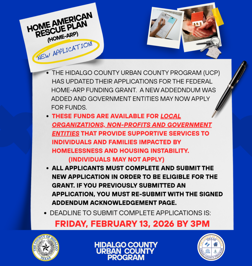 EDINBURG, Texas – The Hidalgo County Urban County Program (UCP) has released a newly revised HOME-American Rescue Plan (HOME-ARP) application for its federal funding opportunity, which is now open to eligible community service providers and government entities as well. More than $1 million in funds are available for government entities and local organizations that provide critical services to individuals and families impacted by homelessness and housing instability.