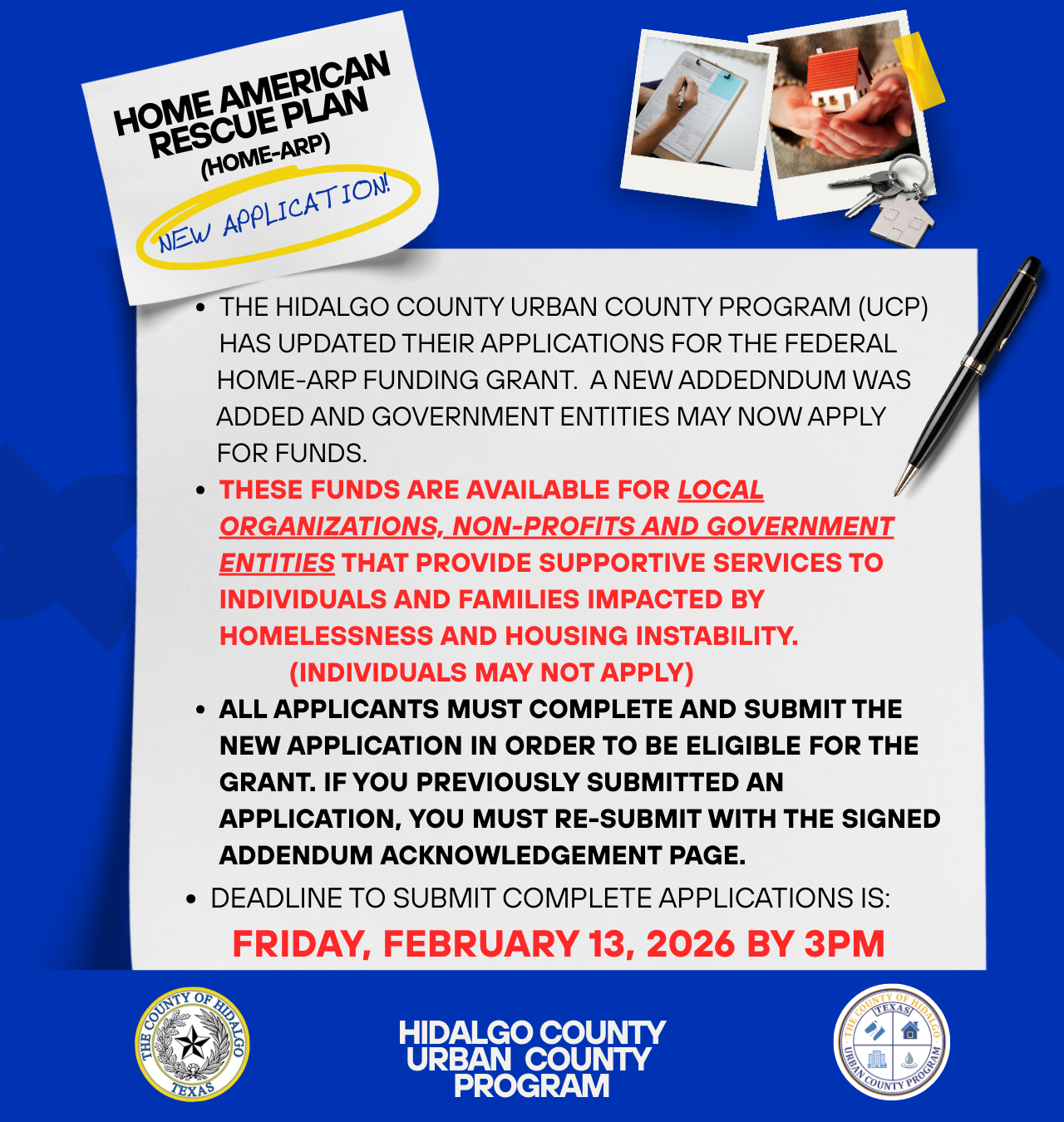 For more information about the HOME-ARP Supportive Services NOFA, eligible activities, or application requirements, visit our website or contact the Hidalgo County Urban County Program at (956) 787-8127 or email homearp@co.hidalgo.tx.us