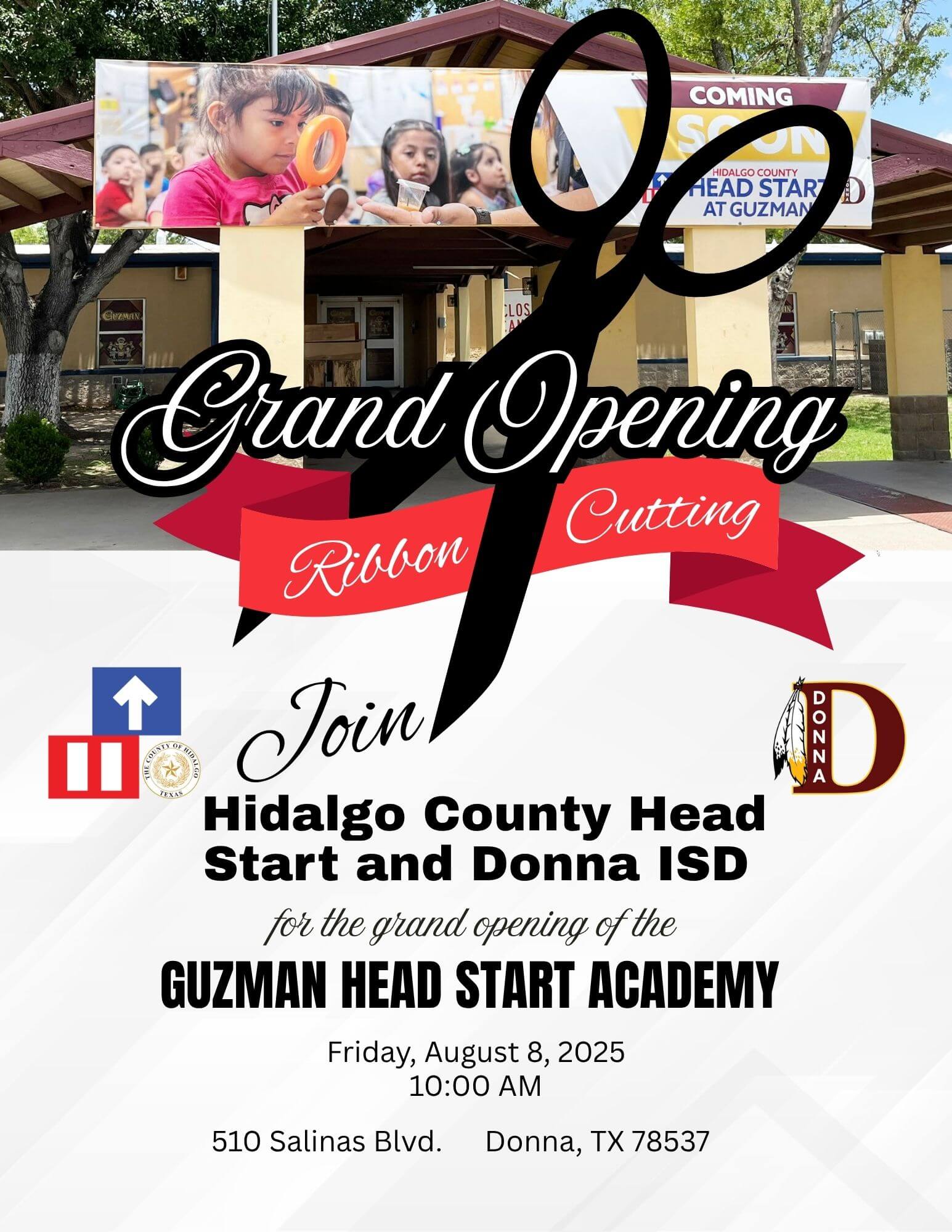DONNA – The Hidalgo County Head Start Program and Donna Independent School District (ISD) are proud to announce a Ribbon Cutting ceremony celebrating the grand opening of the Guzman Head Start Academy located at 510 Salinas Blvd in Donna on Friday, August 8 at 10 a.m.